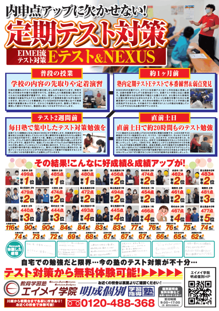 明成個別学習指導塾では、学校の定期テスト対策に力を注いでいます。