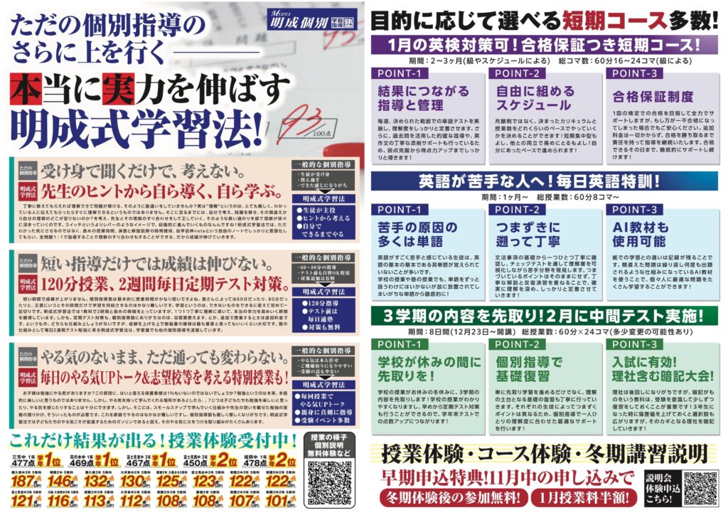 明成個別学習指導塾の個別指導は、通常の個別指導よりも成績が伸びやすい形を取っています。(※成績を上げたい方は、ぜひご説明を聞きにお越しください)