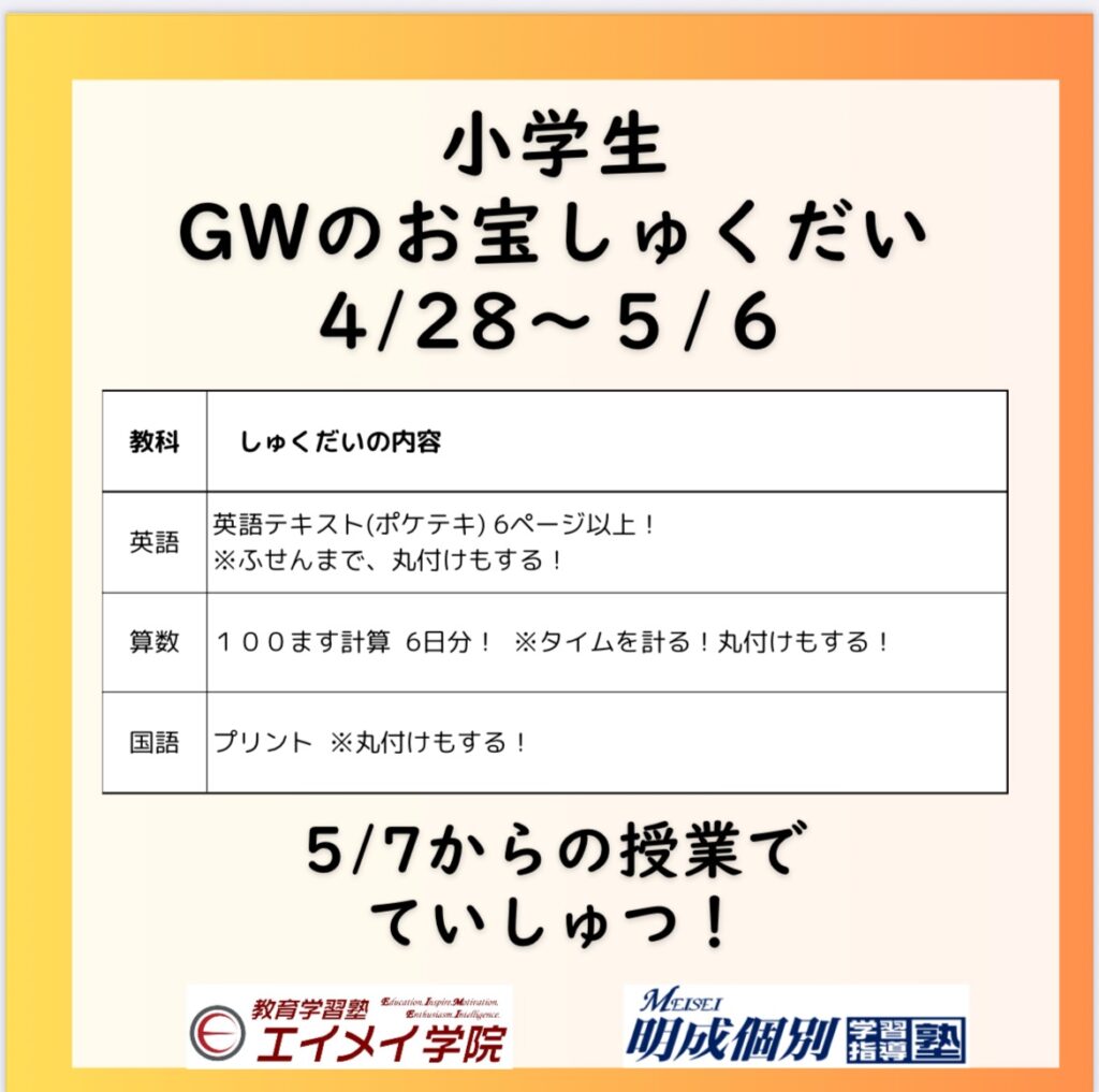 画像の内容でGWの課題をお渡しします!毎日進める課題もあるので、ご家庭でもお声かけのご協力をよろしくお願いします