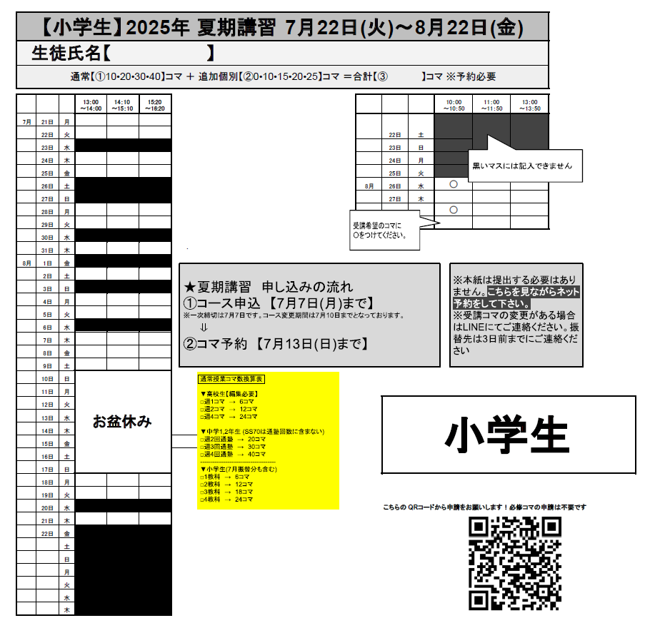 【三芳藤久保】小学生 夏期講習の日程 投稿日 2025年7月15日 更新日 2025年8月6日 著者 そうご カテゴリー 三芳藤久保校舎|明成個別 7月21日(月)から夏期講習が始まります!! 小学生は、複数のコースが用意されているので、お子様に合った内容を選択していただくことができます!それぞれのコースで1つの内容が完結できるようになっているので、苦手な単元ごとに学習を進めていくことができます。この時期に苦手克服や検定合格に向けた勉強など夏休みを有効活用していきましょう!日程関連 シェア ツイート LINE この記事を書いた人 そうご 記事一覧