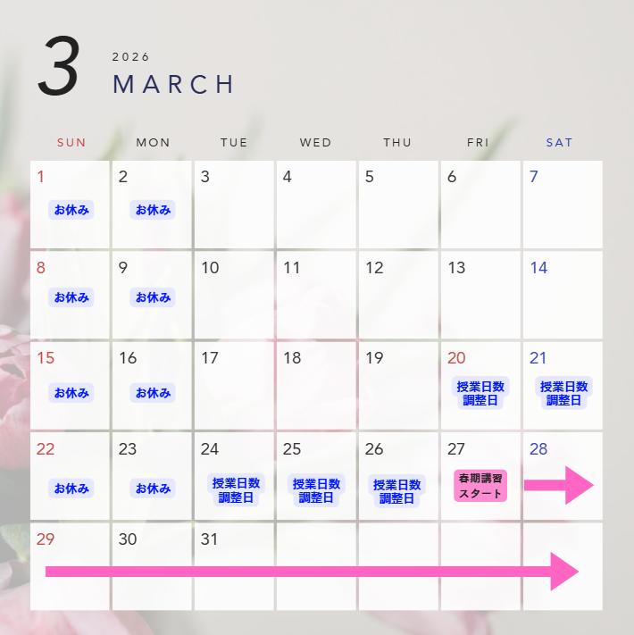 【三芳藤久保】小学部 2月~3月の日程 投稿日 2026年1月28日 更新日 2026年1月31日 著者 そうご カテゴリー 三芳藤久保お知らせ カテゴリー 三芳藤久保校舎|明成個別 小学生の2月、3月の予定表となります!※暫定な予定です。変更や追加がある可能性があります。その場合はすぐにご連絡致します。必ず確認お願い致します!Contents2月予定表3月予定表関連2月予定表主な予定11日(水)~ バレンタイン チョコ実験教室詳細はこちらから!!【三芳藤久保校】2/11 バレンタインイベント準備中…🍫2026年も 理科実験教室開催です! 2月の理科実験教室は、、、 「〜固いチョコの形が変わるのはなぜ?…meiseikobetsu.jp3月予定表20日、21日、24日、25日、26日は年間の授業日数調整のため、授業はございません。1年を通しての授業数には影響ありません。関連 シェア ツイート LINE この記事を書いた人 そうご 記事一覧
