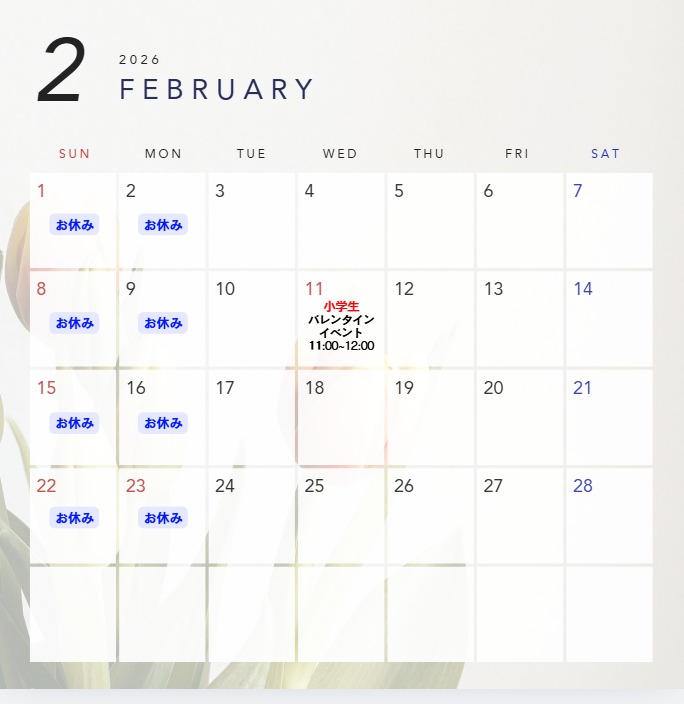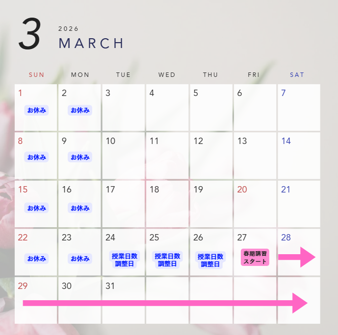 【三芳藤久保】小学部 2月~3月の日程 投稿日 2026年1月28日 著者 そうご カテゴリー 三芳藤久保お知らせ カテゴリー 三芳藤久保校舎|明成個別 小学生の2月、3月の予定表となります!※暫定な予定です。変更や追加がある可能性があります。その場合はすぐにご連絡致します。必ず確認お願い致します!Contents2月予定表3月予定表関連2月予定表主な予定11日(水)~ バレンタイン チョコ実験教室3月予定表24日、25日、26日は年間の授業日数調整のため、授業はございません。1年を通しての授業数には影響ありません。関連 シェア ツイート LINE この記事を書いた人 そうご 記事一覧