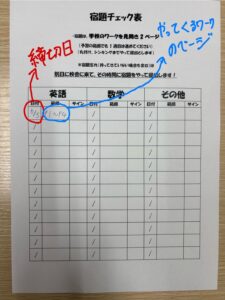 【鶴瀬東】宿題チェック表 投稿日 2025年5月29日 著者 小原 陸 カテゴリー 鶴瀬東お知らせ 宿題チェック表の使い方を説明します!授業でやった教科の部分に「締め切り日」と「宿題のワークのページ」を書きます。(ワークをやる場所は次のテスト範囲のところをやってきてね!)もしここに書いてあるページができていないorワークを持ってきていない場合は授業外の日に来てもらって、ワークを進めてもらうのでしっかりとやっていきましょう! 関連 シェア ツイート LINE この記事を書いた人 小原 陸 記事一覧