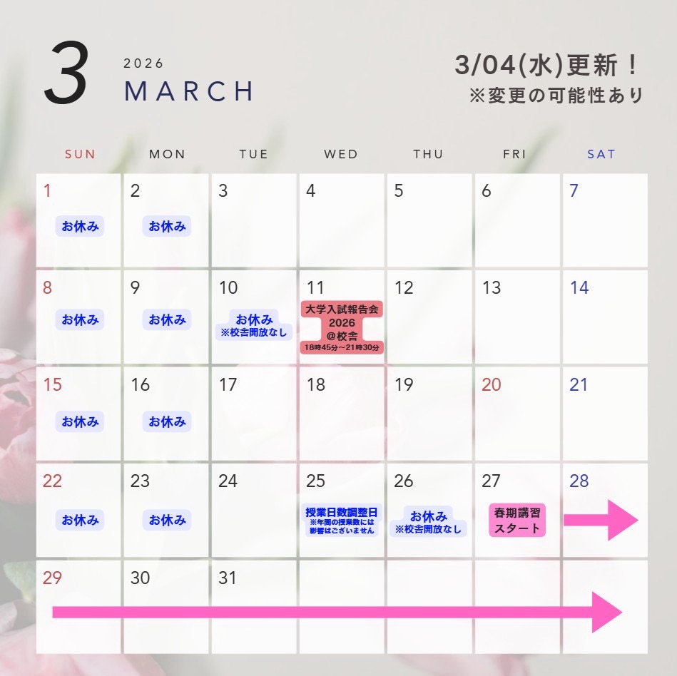27日(金)~ 春期講習スタート!(詳細は後日お知らせします。)