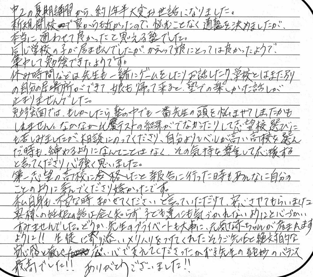 なかなか北辰テストの結果がでなかったりして志望校選びにも苦しみましたが、相談にのってくださり、自分よりレベルが高い高校を選んだ時も、諦めるように促すことはなく、その気持ちを尊重して応援すると言ってくださり心強く思いました。第一志望の高校に合格したと報告に行った時もあんなに自分の ことのように喜んでくださり嬉しかったです。