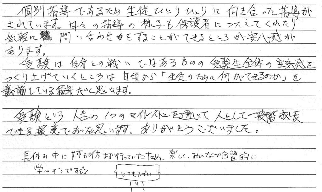 日々の指導の様子も保護者に伝えてくれたり気軽に問い合わせをすることができるところが安心感があります。受験は自分との戦いではあるものの受験全体の空気をつくり上げていくところは日頃から