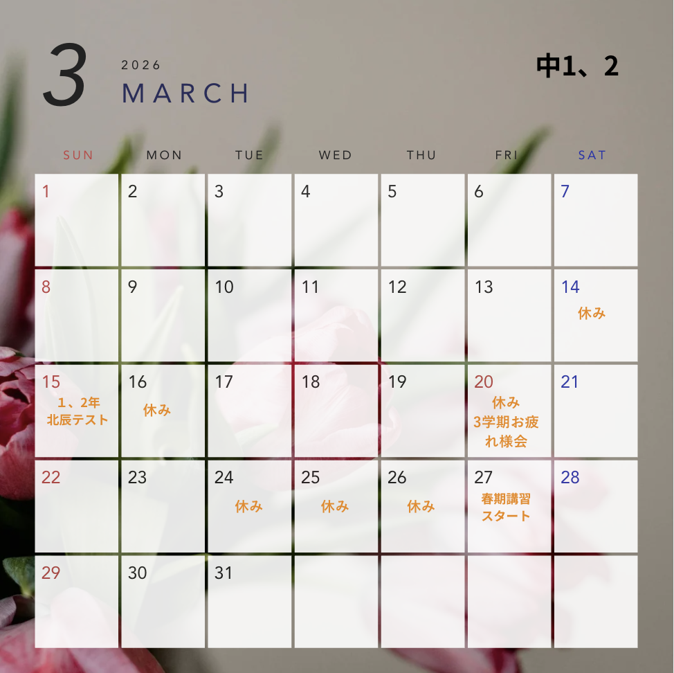 中学1、2年 3月スケジュール 投稿日 2026年3月5日 著者 小原 陸 カテゴリー 新着情報 カテゴリー 明成個別鶴瀬東校舎 カテゴリー 鶴瀬東お知らせ 関連 シェア ツイート LINE この記事を書いた人 小原 陸 記事一覧