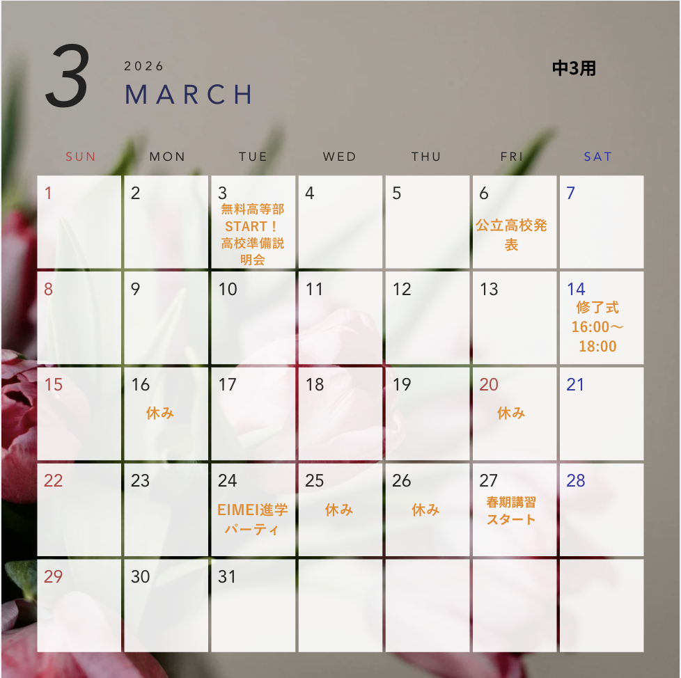 中学3年生 2026年3月スケジュール