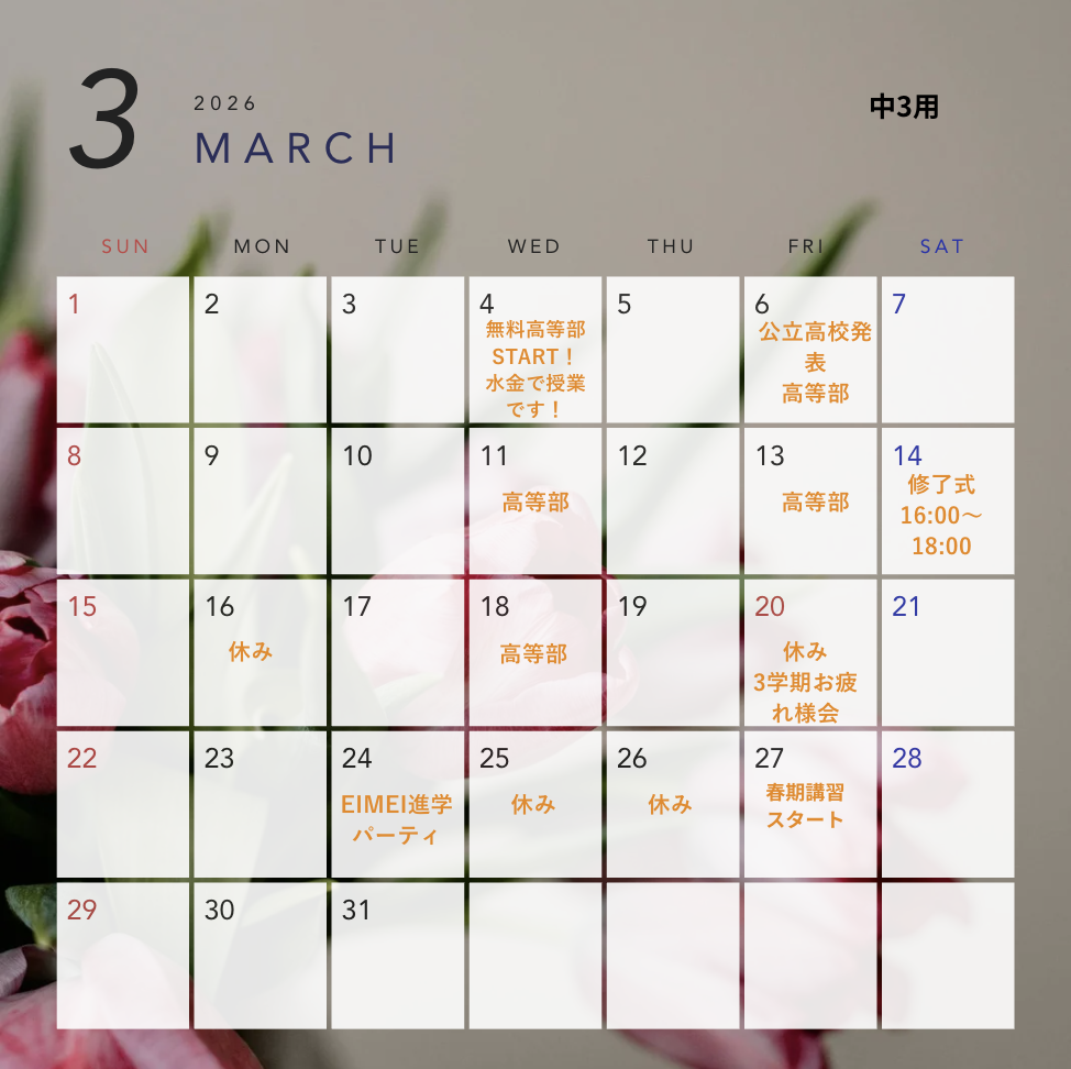 中学3年生 3月スケジュール 投稿日 2026年3月5日 著者 小原 陸 カテゴリー 明成個別鶴瀬東校舎 カテゴリー 鶴瀬東お知らせ 関連 シェア ツイート LINE この記事を書いた人 小原 陸 記事一覧