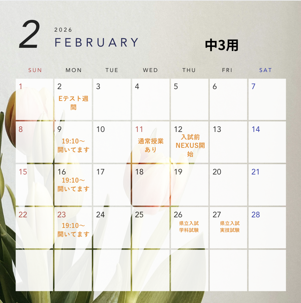 中学3年生2026年2月スケジュール 投稿日 2026年1月28日 著者 小原 陸 カテゴリー 明成個別鶴瀬東校舎 カテゴリー 鶴瀬東お知らせ こちら、中学3年生用のスケジュールとなっております!ご不明な点ございましたら、公式ラインでお気軽にお問い合わせください!関連 シェア ツイート LINE この記事を書いた人 小原 陸 記事一覧