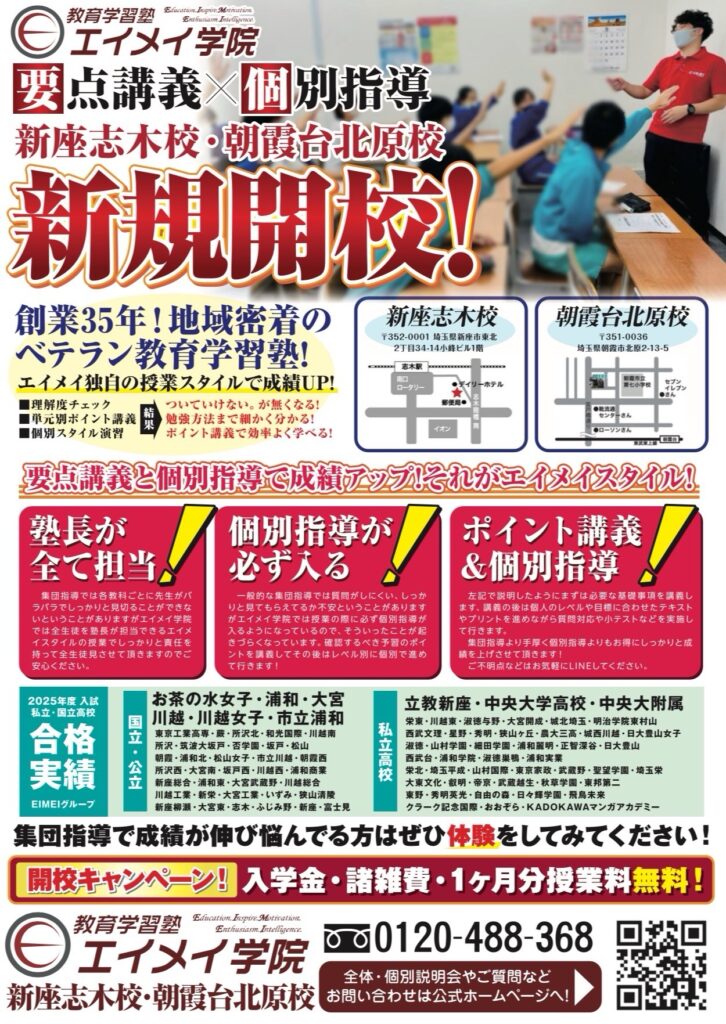 朝霞市(西原・北原・朝志ヶ丘・浜崎・岡・宮戸)や志木市(宗岡)にお住まいで、 朝霞第七小学校・朝霞第二小学校・朝霞第三小学校、 朝霞第二中学校・朝霞第五中学校、 宗岡小学校・宗岡第二〜第四小学校、宗岡中学校・宗岡第二中学校に通っているお子さまで朝霞台、北朝霞周辺の個別指導塾をお探しの方は、 ぜひ当校へご相談ください。 地域密着型の学習サポートで、お子さまの学力アップを全力でサポートします。 お問い合わせは↓↓↓こちらからお願いします