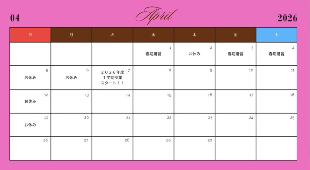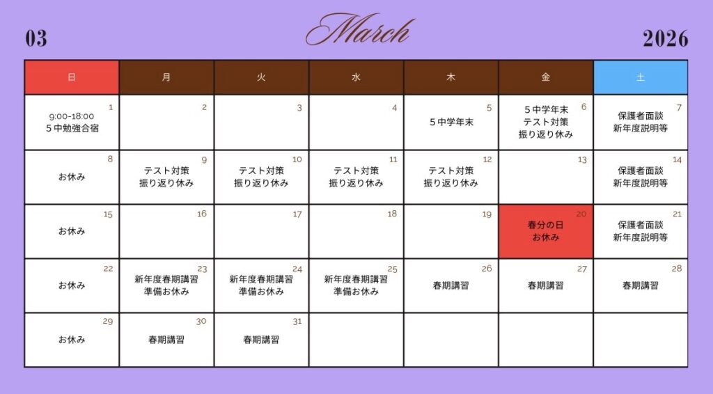 2026 3月のスケジュール 投稿日 2025年12月12日 著者 nakadaryota カテゴリー 明成個別朝霞台校舎 ・テスト対策振り返り休み、春季講習&新年度準備休みがあります・3月から学年が1つ上がりますいよいよ2年生は受験生ですね!・春分の日はお休みをもらいます・小学生のテスト対策振り返り休みは春期講習に振替にて対応いたします。・新年度準備のお休みはカリキュラムに含まれておりませんのでご安心ください。・春期講習は26からスタート予定です。2026年度1学期は4/7からとなります🔥関連 シェア ツイート LINE この記事を書いた人 nakadaryota 記事一覧