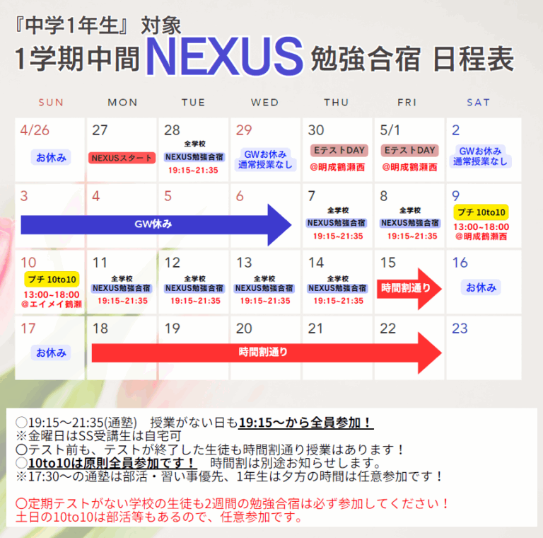 5/7(木)からも Nexus勉強合宿があります! ※GW期間4/29~5/6《 通常授業はご […] -
