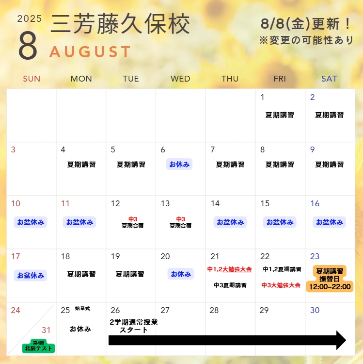 三芳藤久保お知らせ 三芳藤久保校 8月、9月スケジュール