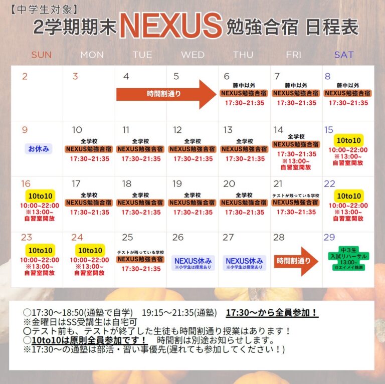 三芳藤久保お知らせ 【三芳藤久保】2学期期末テストNexus勉強合宿について
