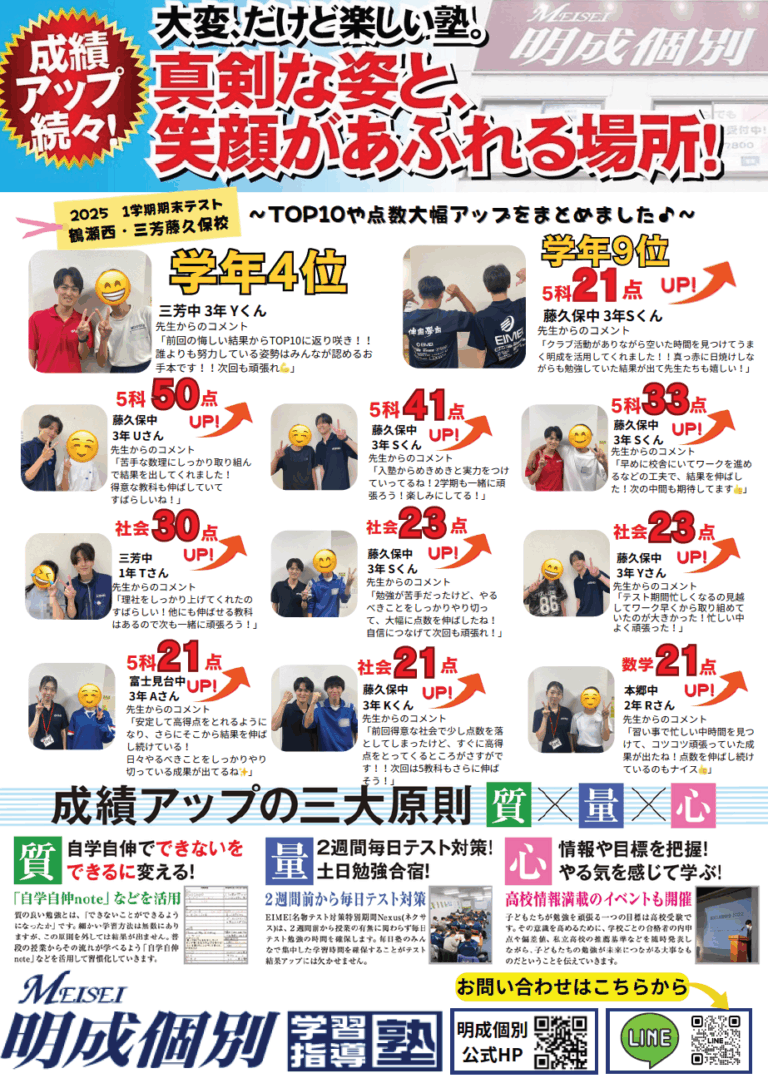 1学期に期末テストの結果です✨️ 中間テストに比べ難易度が上がりますが、各自がベストを尽くし […] -