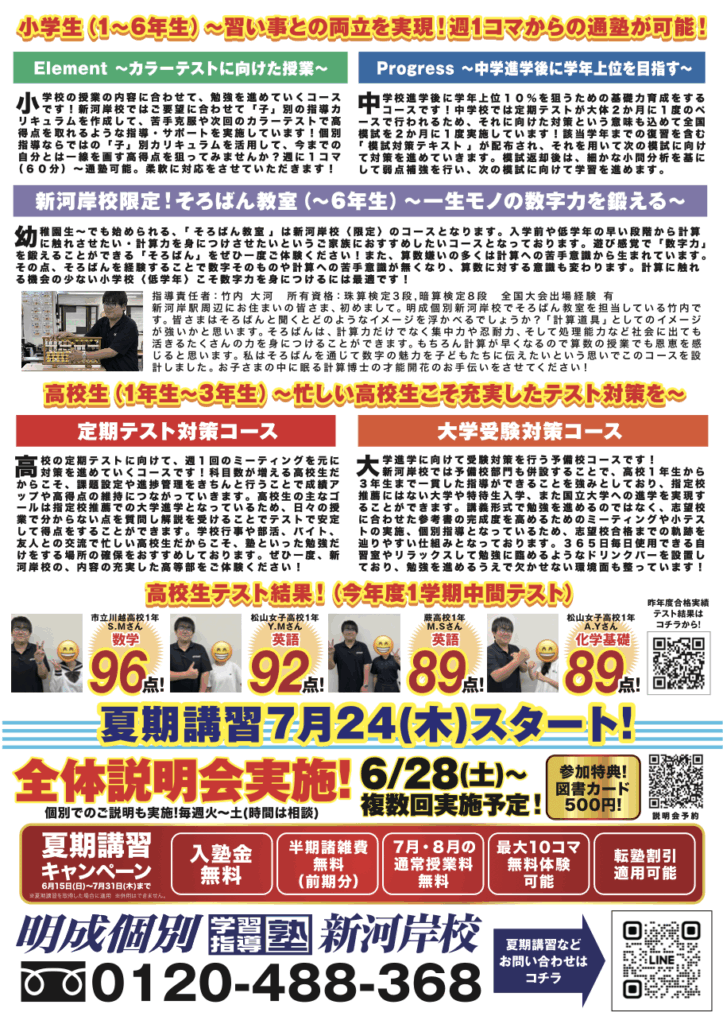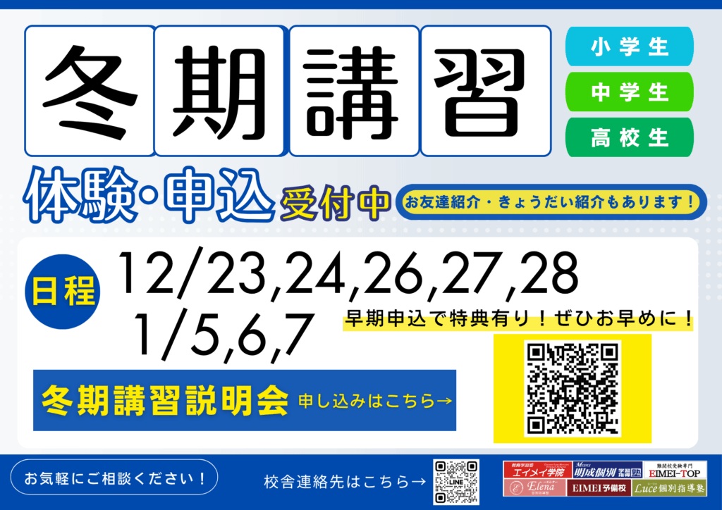 | 対象学年 | 小学1年〜高校3年 《コース》 学童塾、そろばん教室、小学部、中学受験コース、個別指導コース、進学受験コース、難関高校受験コース、高校定期テスト対策コース、高校検定対策コース、EIMEI予備校受験コース、EIMEI予備校総合型選抜入試コース(旧AO) |