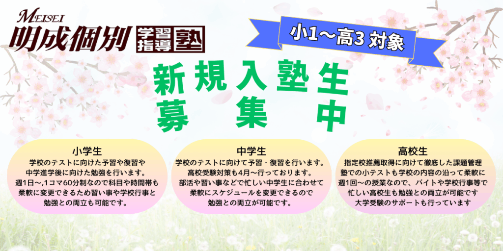 | 対象学年 | 小学1年〜高校3年 《コース》 学童塾、そろばん教室、小学部、中学受験コース、個別指導コース、進学受験コース、難関高校受験コース、高校定期テスト対策コース、高校検定対策コース、EIMEI予備校受験コース、EIMEI予備校総合型選抜入試コース(旧AO) |