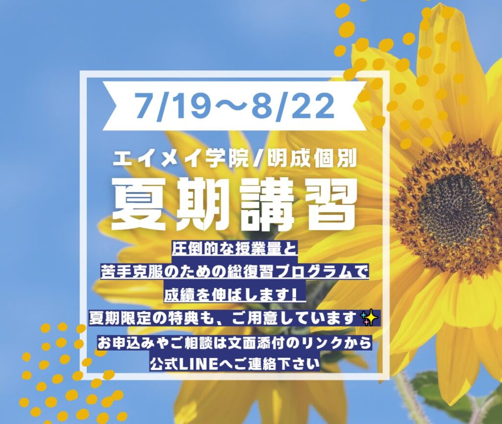 | 対象学年 | 小学1年生〜高校3年生 《コース》 学童塾、小学部、中学受験コース、個別指導コース、 進学受験コース、難関高校受験コース、高校定期テスト対策コース、高校検定対策コース、EIMEI予備校受験コース、EIMEI予備校総合型選抜入試コース(旧AO) |